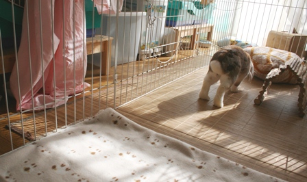 ケージのお掃除中はサークルに出て、ケージがキレイになるのを待っています。