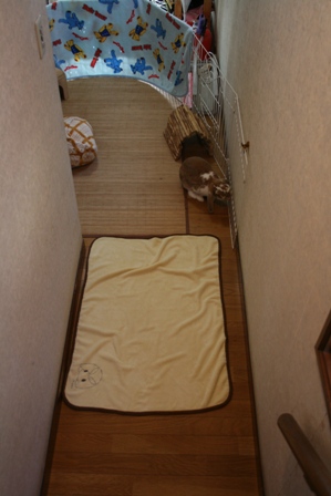 フローリングが苦手なハルは毛布の上から動けません。