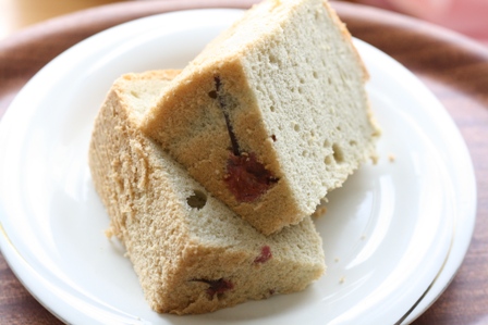 桜の花の塩漬けと桜の葉っぱのパウダーを使っているので、とても春らしい香りのシフォンケーキができました♪