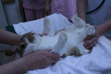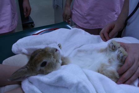 昨年フユがソアホックでお世話になった病院では、うさぎさんをひっくり返してベルトを巻いて固定し先生が診察します。