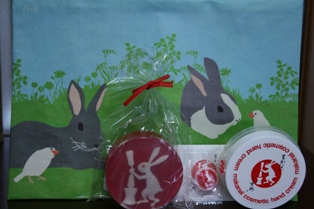 左から石鹸・うさぎさん飴(非売品)ハンドクリーム