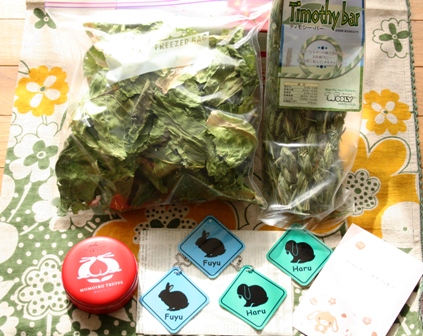 ハルとフユへはチモシーバーとうさぎのしっぽの乾燥キャベツ(大好物)