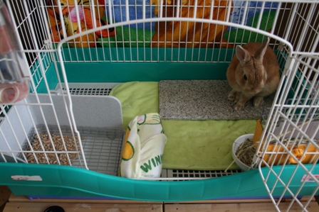 フユの足の負担を軽減させるため、フユのケージから木製ベッド、キューブボックス、